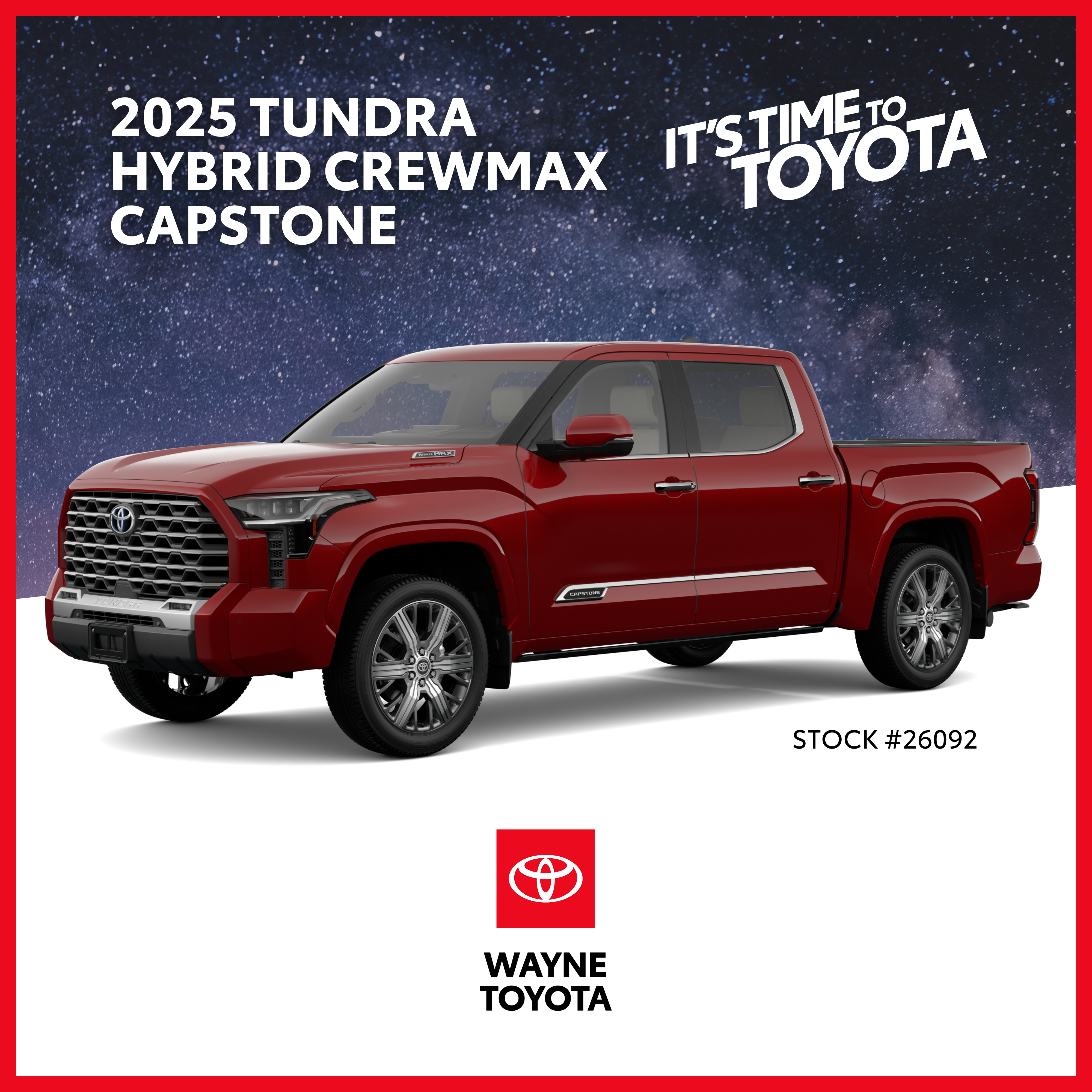 2025 Tundra Hybrid CapstoneReceive your first six factory-recommended maintenance services plus $4000 in Wayne Toyota Bonus Cash & $1000 in manufacturer rebates with the lease or purchase of an available 2025 Tundra Hybrid Capstone $6,609 in added value! | ![]() |